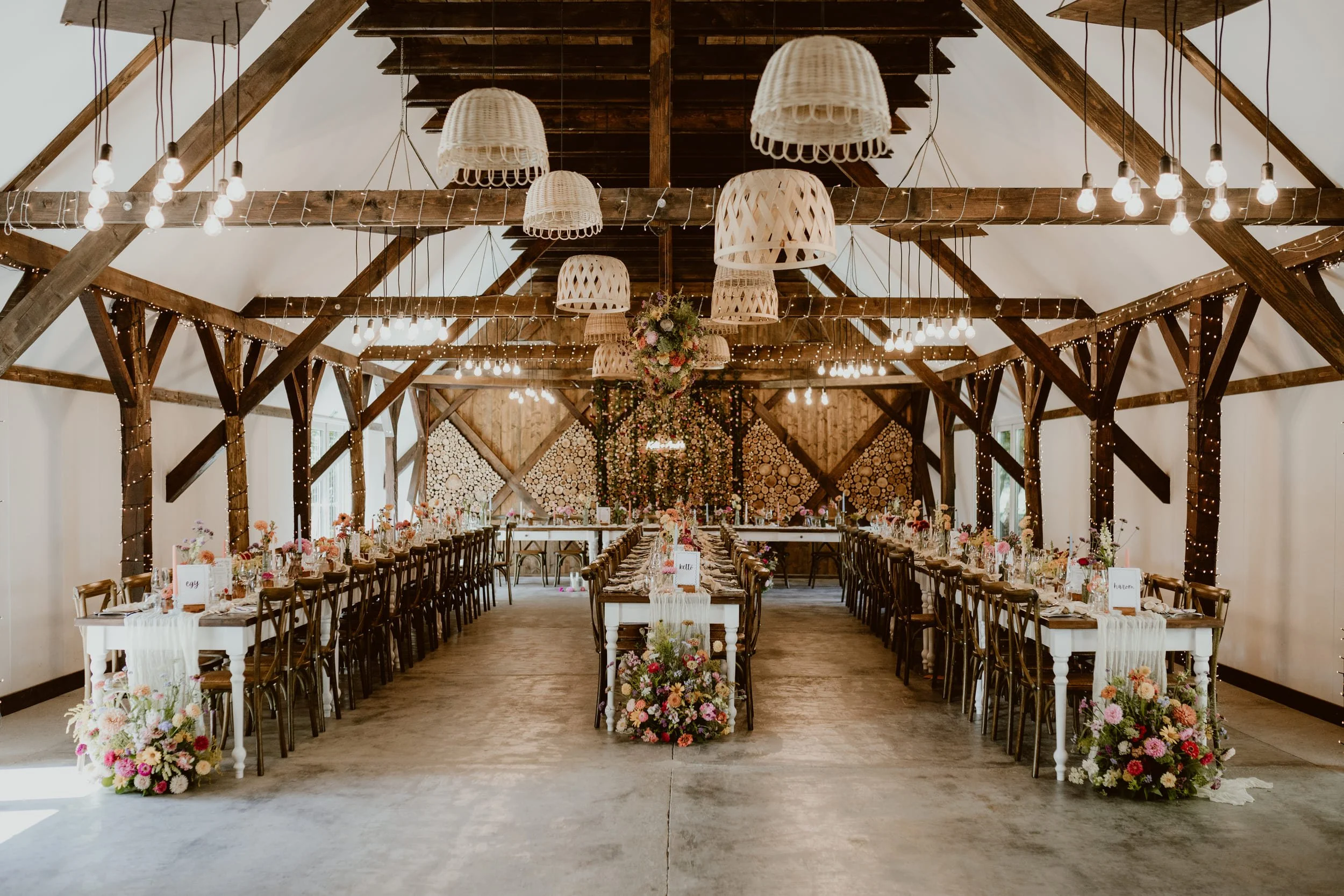 Képzeljétek el a magas, nyitott tetőszerkezetű pajtát, látható gerendákkal, meleg fa burkolatokkal és lágy fényfüzérekkel, amelyek esténként aranyló ragyogásba borítják a teret. A tágas belső tér egyszerre impozáns és meghitt – tökéletes vacsorához és hajnalig tartó ünnepléshez.